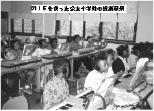 敢えて定義するなら、MIEはCMI(Computer Managed Instruction)である。教師の耳の数は2つでこれは未来永劫変わらない。にもかかわらず、子どもの数だけの音を聴かなければならない。聖徳太子でも無理な話である。MIEではどの子どもがどの音を(キーを)押しているかをMacの画面上で同時に30人分モニターできる。しかも、それを記録することもできる。勿論前にも述べたように演奏データではなく、どの音を弾いたかと言う記録ではあるMIEを使った公立小学校の授業風景Macであれば機種を問わないMIEは教師がどんなコンセプトを持ち、どんな風に生徒に接するかで、その効果が大きく変る。が、従来のMLではタイムシェアリングでしかできなかったことが、コンピュータのおかげで同時にチェックできるようになったのである。このコンピュータによる指導の管理はCMIの特徴である。
