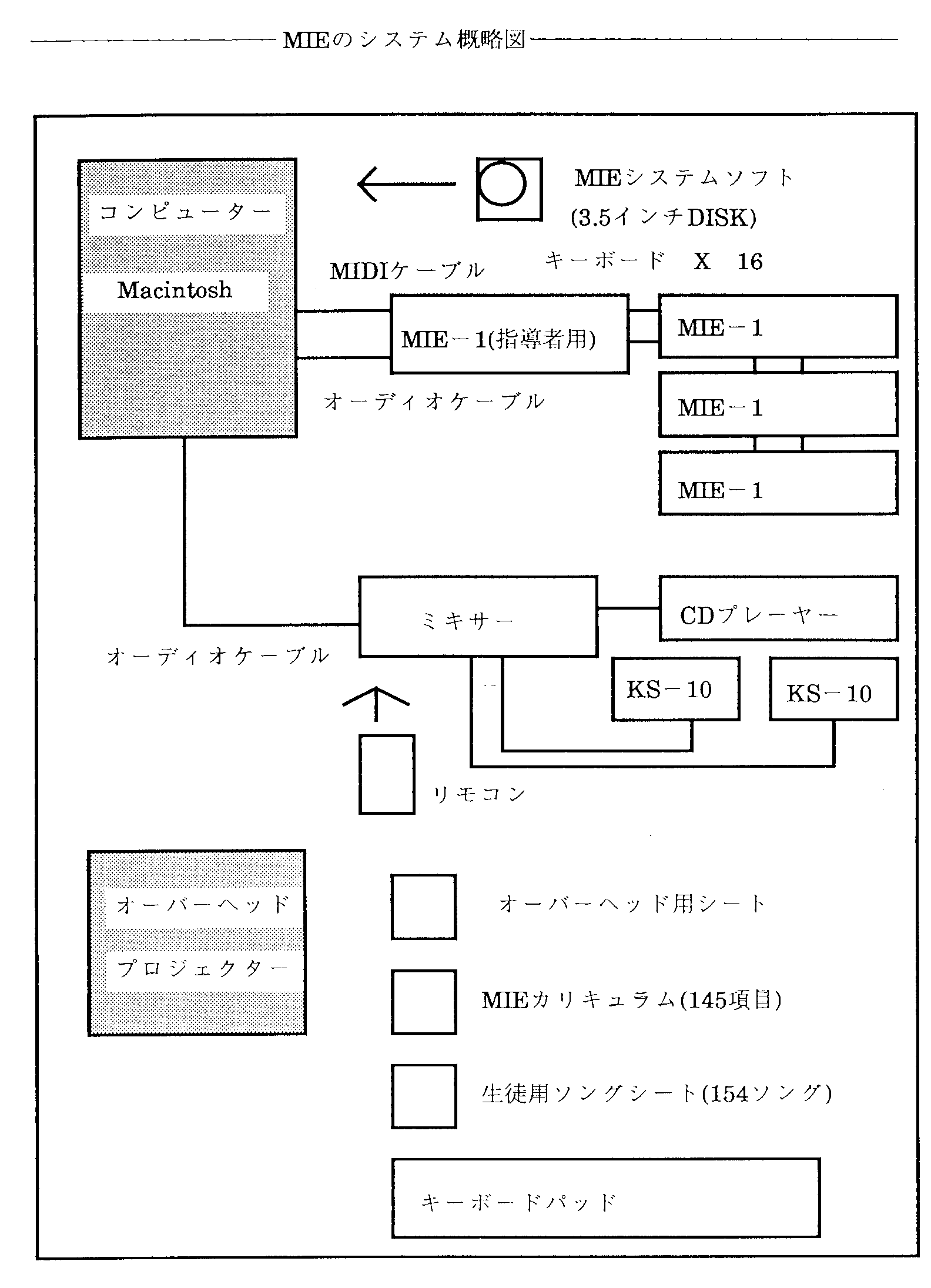 MIEのキャッチフレーズは”Untill today,school music has been taught by the book"である。教科書だけに依存してきた従来の音楽教育に対して、MIEはコンピュータがマネージする145項目のカリキュラムを提案している。